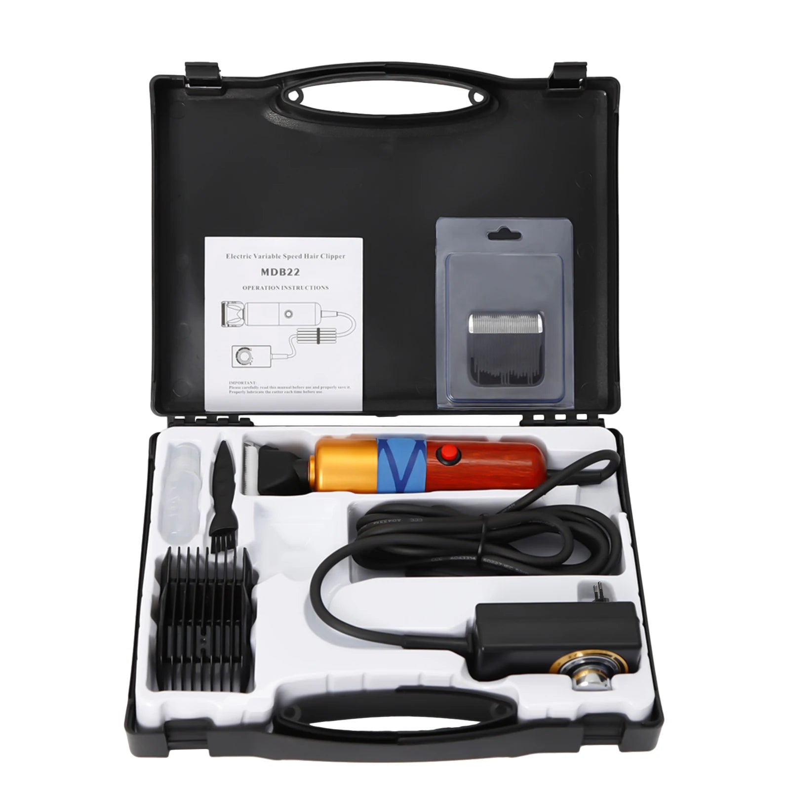 This professional electric pet hair clipper is designed for grooming dogs, cats, and sheep. It features a low-noise motor to help reduce disturbance during grooming sessions and a variable speed control to support different coat types and grooming needs.